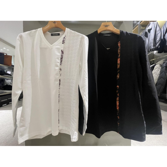 Different fabric docking long sleeves cut-and-sew. Fine gloss jacquard and flower pattern material are incorporated into the line to create a brand-like outfit.
