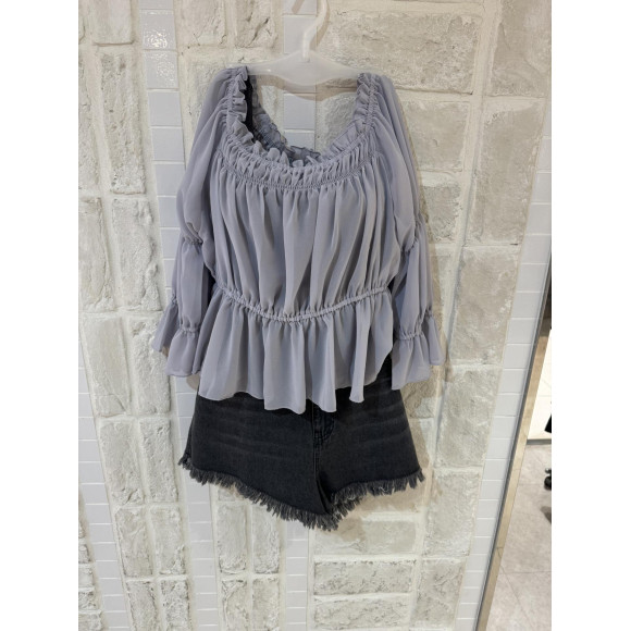 The top has a feminine silhouette with puff sleeves and shirling gathers.