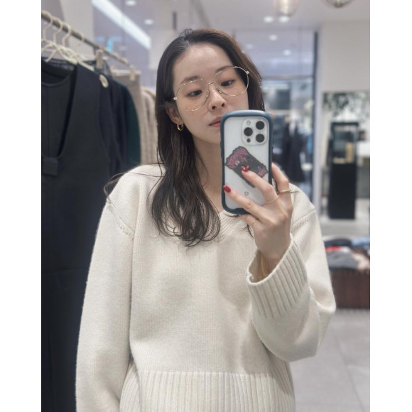 An adult outfit with a rough, loose feminine V knit with a feeling of looseness and coordination with glasses.