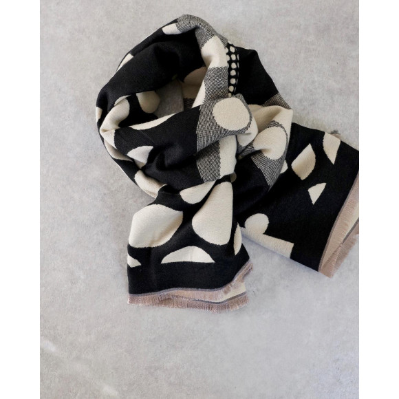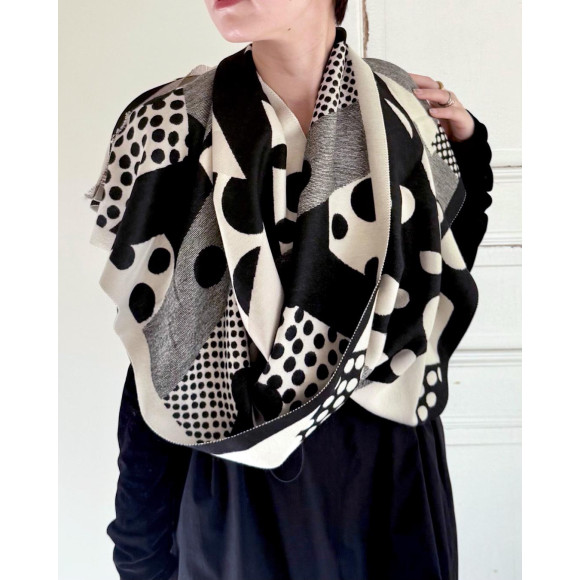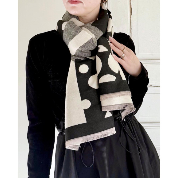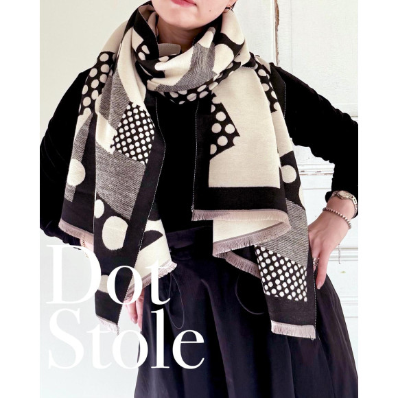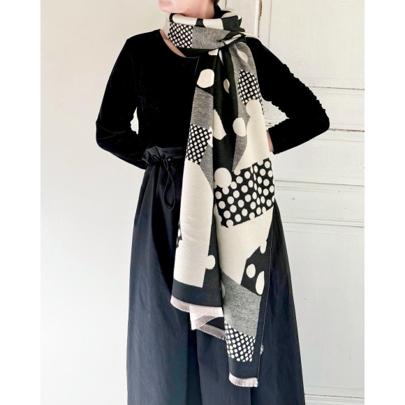 A patterned stole with a collage of dots of various sizes. The monotone color scheme makes it easy to match your usual styling and is perfect for creating a creative atmosphere.